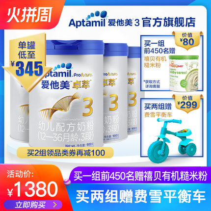 【爱他美 Aptamil 官方旗舰店出售 卓萃幼儿配方奶粉 3段 900g*4罐 欧洲进口白金版 劵后1320元包邮】