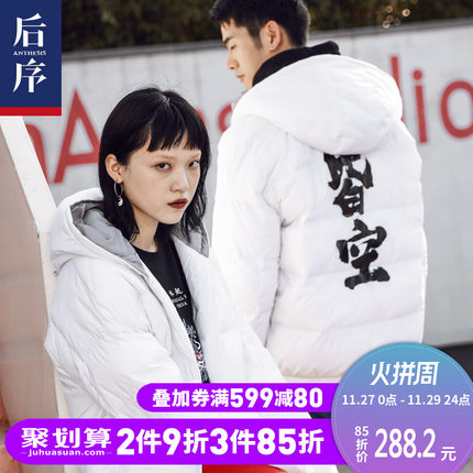 后序 国潮牌羽绒服,原创设计,后背有书法文字印花,别具一格。外层为聚酯纤维材质,内里填充90%白鸭绒,轻盈保暖,适合10度左右温度穿着。