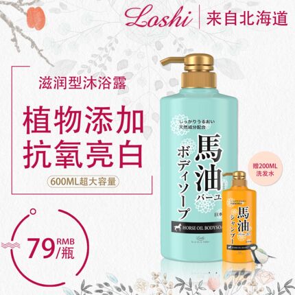 【超值党!日本进口 loshi 马油沐浴露持久留香浴乳液600ml +200ml洗发水 劵后29元包邮 平常79元】