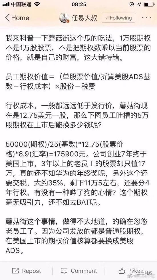 行权成本一般都远远低于发行价,换算后的价值都需要除以相应基数,实际价值缩水甚多。根据员工期权价值=(单股票价值/折算美股ADS基数-行权成本)×股份-税费 这一公式,假设蘑菇街现在是12.75美元一股,那么该员工吐槽的5万股期权在上市后为 50000(期权)/25(基数)*12.75(股票价格)*6.9(汇率)=175900元。