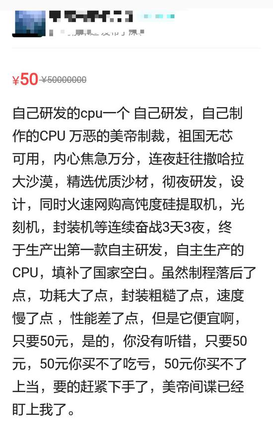 在一个小型电商行业研讨会上,一位演讲人指着PPT演示中的画面笑着问道。图片中是某二手交易平台上,卖家出售的所谓自主研发的“电脑CPU”,号称填补了若干空白,而售价仅为50元一枚。“太奇葩了,就是卖家觉得好玩恶搞的吧?”现场有听众回应。