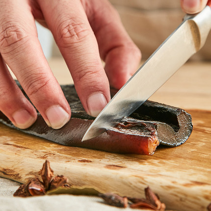 这款腊肠优选后腿猪肉、山西汾酒、鱼露、白砂糖、天然肠衣制成,外观饱满,色泽光亮,颜色自然,脂肪雪白不含杂质。好的腊肠切面平滑完整,肉质均匀,表面无粉状无异物,皮肉不分离。蒸熟状态下,好腊肠油滴欲滴,酒香醇浓,口感有嚼劲,肉质有弹性。包装是用专用纸质和插画设计包装,传达了传统民间浓浓的礼意。上面的字体用烫金工艺,大方别致,增添华丽气息。适合过年送礼。