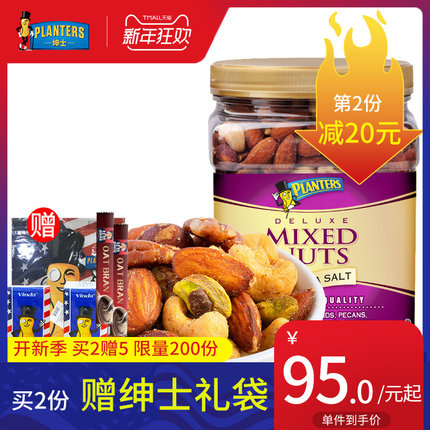 【5种进口坚果无花生:963g 美国 绅士 Planters 盐焗大罐混合坚果组合 券后90元包邮(专柜250元)】