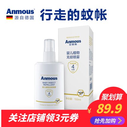 【驱蚊长效4小时:德国 Anmous 安慕斯 母婴驱蚊喷雾 100ml 券后29.9元包邮(长期89.9元)】