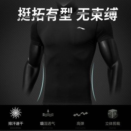 【中国李宁,必属精品】专业健身紧身衣,布料采用四面弹速干透气涤纶运动面料,面料弹力十足,上身后不紧绷。其中使用的黑色布料洗水不掉色,质量有保证,安全更放心。