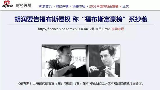 胡润本来想告《福布斯》剽窃他搞中国富豪榜的创意,后来想想算了。毕竟他这套也是从《福布斯》那里学来的。