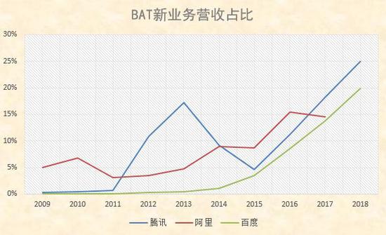 如果将观察的时间维度延长至10年,我们会发现,新业务在BAT营收中的占比在不断提高。BAT都在努力拓展新业务,并试图影响自身的营收结构。