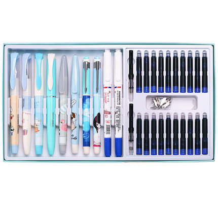 4.9超高评分轻便笔身,防滑正姿,卡通图案,清新色彩,专为孩子书写贴心考虑!3支笔+1包修正贴+12个墨囊+10个笔尖+2个上墨器。