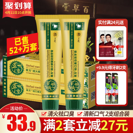【百草堂医药出品 草方 清火/去口臭 牙膏100g*2支*2件 双重优惠20.8元包邮】