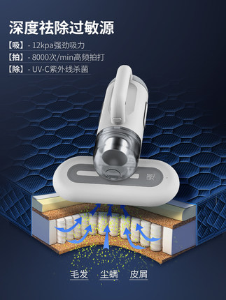 这款无线手持家用小型除螨仪吸尘器,8000次/min高频拍打,将深层的螨虫打出来,12000PA强劲吸力,震荡式吸螨,搭配无刷吸头,不损害衣服和床被,UV-C石英玻璃紫外线灯管,净螨杀菌。充满电2.5小时,使用25分钟。