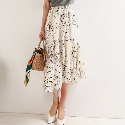 【2019夏季新款韩版中长款印花闺蜜装雪纺显瘦不规则荷叶边半身裙子 券后39元 】