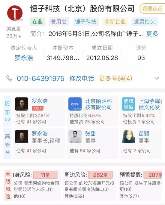 在锤子科技“停摆”的这段时间,罗永浩本人连续卸任了一系列锤子旗下子公司法定代表人,而锤子科技也因为一系列经济纠纷背上了众多官司。根据天眼查的数据显示,目前锤子科技公司主体锤子科技(北京)股份有限公司目前自身风险11条、周边风险262条、预警提醒287条。这一系列的风险提示下,锤子科技的未来本身就已经蒙上了一层阴影。