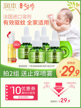 润本 无味电热驱蚊液 4液+1器,植物精油萃取,无烟无味安全,无刺激,母婴适用,长效驱蚊,一夏无忧~商家领券拍下24.9元包邮