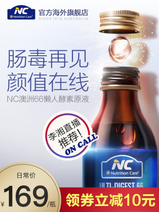 天猫NutritionCare海外旗舰店售价169元,点击领取40元优惠劵,劵后129元包邮。NC澳洲66懒人酵素原液 清肠排宿便,澳洲进口 养颜先排肠毒。