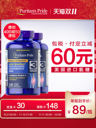 美国原装 Puritan‘s Pride/普丽普莱 双倍氨糖维骨力 240片*2瓶,护关节实力派!每天3粒随餐服用~阻止钙流失,润滑保护关节,全能养护,普丽普莱海外旗舰店预售价元,支付30元定金立减60元,再领取20元券,实付158元包邮。