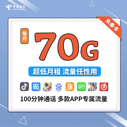 月租19元电信70G大流量卡 激活送爱奇艺会员6月 1.1元包邮