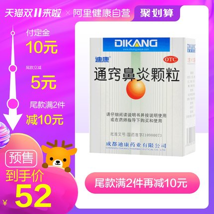 迪康 通窍鼻炎颗粒 2g*12袋*3盒,阿里健康大药房双11预售 售价¥57,支付¥10定金立减¥5,叠加¥5优惠券,最后实付¥47包邮到手,4.9高分好评。