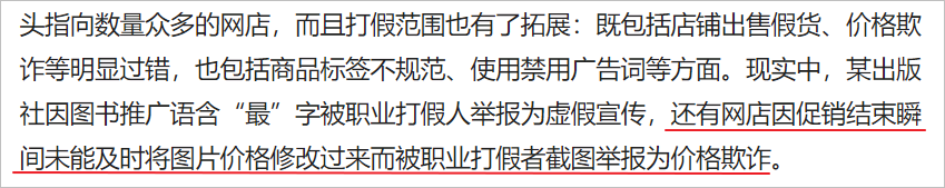 根据人民日报之前的报道,有职业打假者在促销结束的瞬间,趁着网店没能及时更改图片价格,借此截图举报商家价格欺诈。