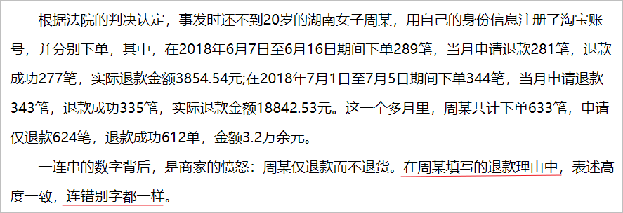 她曾在一个多月的时间内,下了 633 笔订单,其中申请仅退款而不退货 624 笔,成功 612 单,金额 3.2 万余元。
