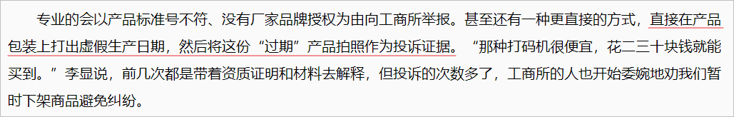 要是抓不到商家的把柄,他们还会无中生有、自行作假来索赔。往食品包装上自己打出虚假生产日期,再用这份 “ 过期 ” 的产品作为证据完成投诉。