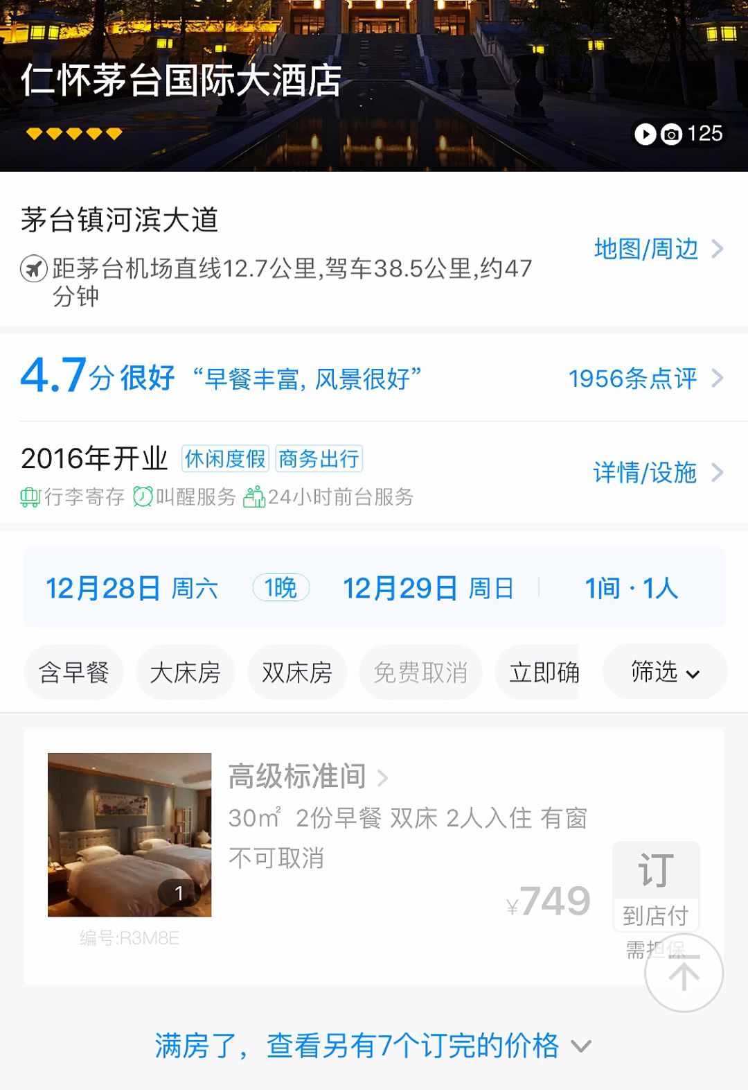 携程上显示,直到明年春节后,茅台大酒店所有房型都处于“已订完”状态。酒店总台告诉《棱镜》,想要预定,只能靠“捡漏”,有人临时退房才可以。目前,房源基本预留给茅台接待所用,已经不对散客开放。