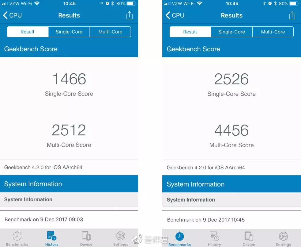他去换了一块全新的电池,然后又测了一遍 Geekbench。Boom!单核飚到 2526 分,多核到了 4456 分,几乎要比换电池之前要翻倍了~