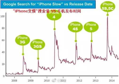 这个图片说的是每次新 iPhone 发布,人们用 Google 搜索 “ iPhone 变慢 ” 的搜索量就会暴增。