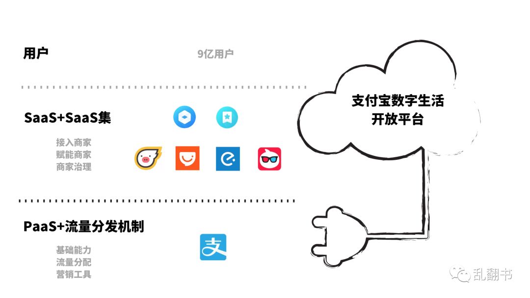 所以换个视角看,支付宝现在做的事可以理解为线下交易先做一层PaaS+流量分发机制,中间的SaaS交给了饿了么、口碑、飞猪、淘票票,然后还有另外一种SaaS是小程序。