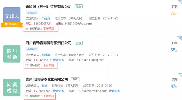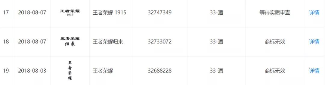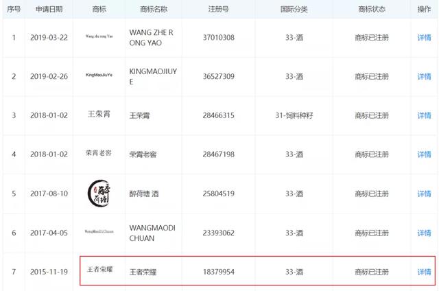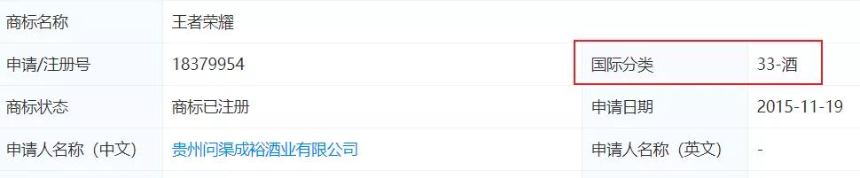 这次把腾讯爆菊的就是其中一家贵州问渠成裕酒业有限公司,他们将「 王者荣耀 」抢注成了酒类商标, 18 年 5 月已经注册公告了。