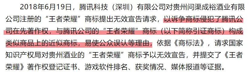 于是2018 年 6 月腾讯表示,这家酒业侵犯了腾讯在先的著作权,对他们所注册的「 王者荣耀 」商标提出无效宣告请求。