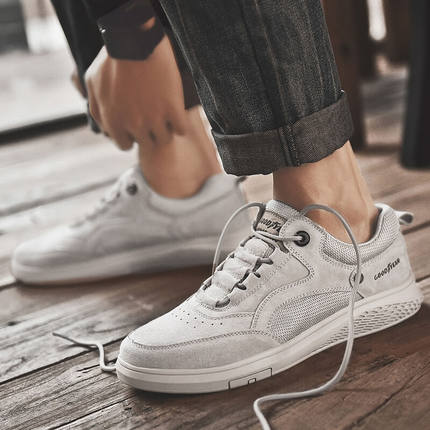 本产品是由灵杰保罗发售,固特异提供生产设计的联名款。这款固特异 男士春季款 网布休闲运动鞋,鞋面采用猪巴革+网面设计,两侧为透气孔和网布设计,透气性好,尤其适合春夏穿着。大底采用固特异招牌轮胎橡胶底,抓地力强,同时轻便、耐磨又耐用。复古平底款设计,休闲百搭。一共15款可选,他家的鞋子性价比较高,值得入手。