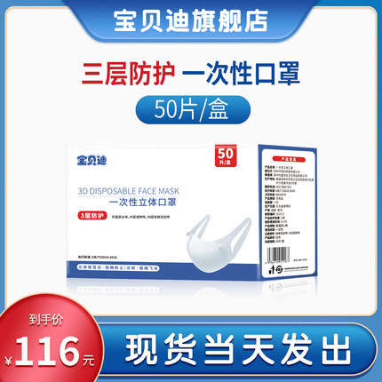 宝贝迪旗舰店116元,可领50元优惠券,实付66元到手,折合1.3元一只,现货现发。这款口罩三证齐全,基于GB/T32610-2016国标生产,专业厂家出牌,三证齐全。现在口罩已经开始便宜啦,量小灵活,不浪费。一次性防护口罩,三层无纺布设计,内含加厚熔喷无纺布,三褶设计,空间大,隐形可塑鼻梁条,佩戴舒适。
