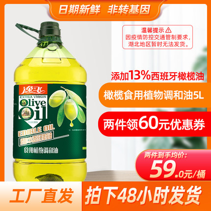 【逸飞 非转基因植物调和油 5L 13%西班牙橄榄油 59元包邮】