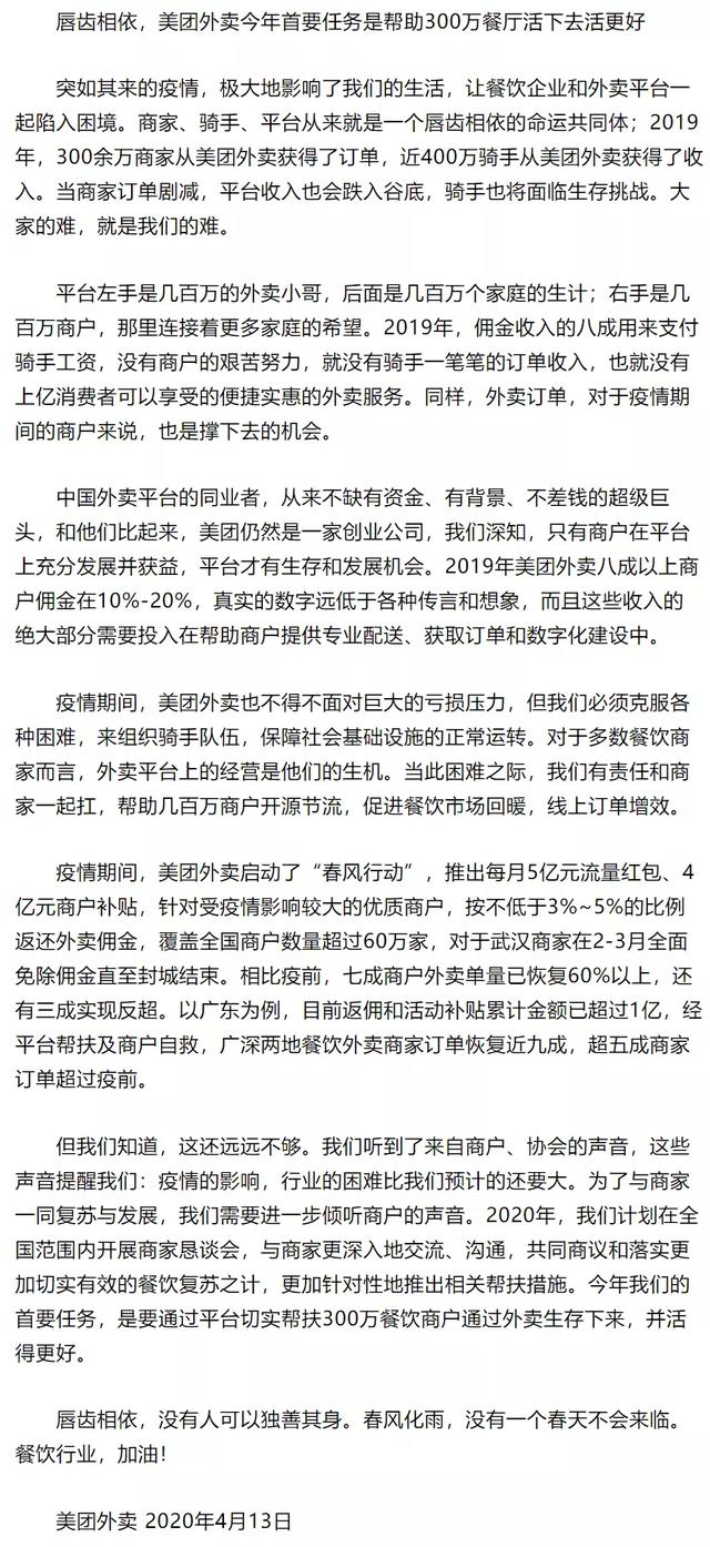 如果外卖平台一昧的追求眼前的利益,商户的处境会更艰难,甚至在这次困境中倒下,长远看来,对于依附于商户赚钱的平台也是不利的。