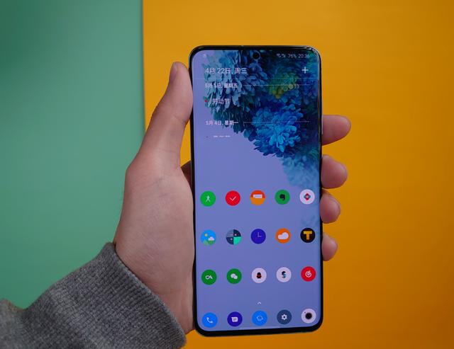 以小巧的全面屏为卖点的三星的旗舰 S20,拿在手上一比较,也感觉是大屏手机了。( 差评第一手模是个左撇子 )