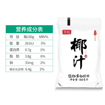 鲜榨椰汁,不添加香精、色素、防腐剂 45天短保锁鲜,放心的品质,健康营养。目前天猫商城菲诺纯旗舰店180ml*12袋售价¥58,可使用¥20优惠券,实付¥38包邮