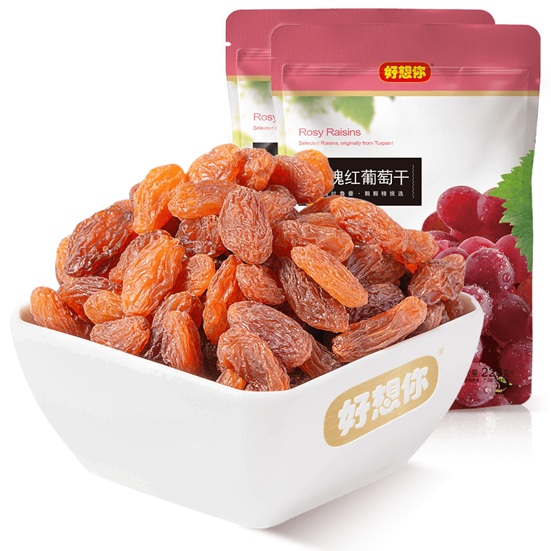 精选新疆吐鲁番特级优质玫瑰红葡萄,自然晾干而成,新鲜无添加,晶莹剔透,粒大无核,饱满有嚼劲,口感甜糯,目前天猫商城好想你官方旗舰店售价¥39.9,可领取¥20优惠券,实付¥19.9包邮,到手4袋共912g。