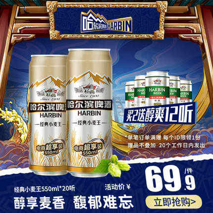 【哈尔滨啤酒 小麦王550ml*20听 59.9元包邮 买2件送醇爽12听】