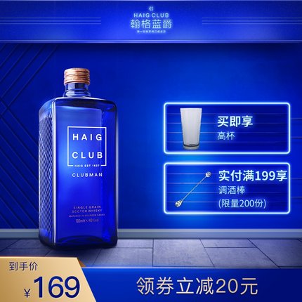 天猫翰格蓝爵官方旗舰店189元,可领50元优惠券,实付139元到手,持平历史低价,下单还多赠高杯,规格: 700ml。翰格雅爵是帝亚吉欧旗下品牌,其标志性的幽蓝色瓶身颜值超高,品牌国际巨星大卫-贝克汉姆合作出品。逼格十足,适合朋友聚会,珍藏馈赠。单一谷物威士忌(single grain whisky)由大麦芽、玉米、燕麦等原料酿造,口感清爽,清甜馥郁,饮用时加入冰块或纯饮均有不俗的表现,而将其与可乐搭配饮用,则会碰撞出令人惊艳的美妙火花,也可以将50ml翰格雅爵与150ml英式果味红茶倒入高脚杯中搅拌并放入冰块,最后放上一片柠檬作为装饰,别有一番风味。