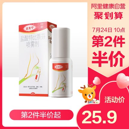 天猫「阿里健康大药房」,第三款/单盒 36.8元,可领10元优惠券,实付26.8元到手。这款达克宁 盐酸特比萘芬喷剂,针对症状专门研制,主要成分盐酸特比萘芬,能深入杀菌专治脚气,液体制剂,特含酒精,喷涂后能快速渗透,规格是30ml。