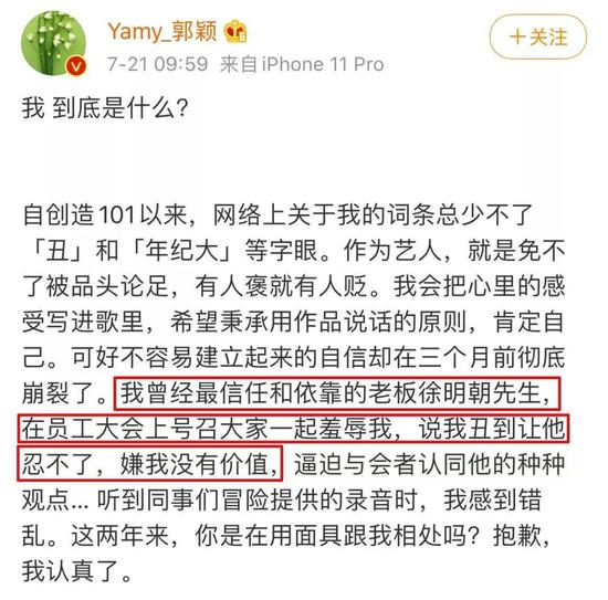 她公开了一则所属经纪公司“极创引力”的员工大会会议记录,时间3分11秒,老板徐明朝当着同事的面,说她“非常丑!很丑!超级丑!是你们所有人里面最丑的!”继而说她装时尚,穿的像刺猬。“有病!不会唱歌!之前就是个伴舞的……”