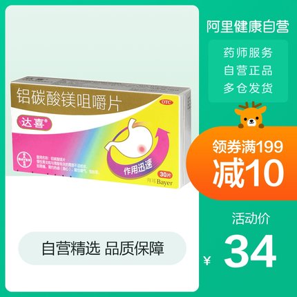 【快速止痛胃酸过多烧心、阿里健康药房 30片 达喜 铝碳酸镁咀嚼片 券后24元包邮】