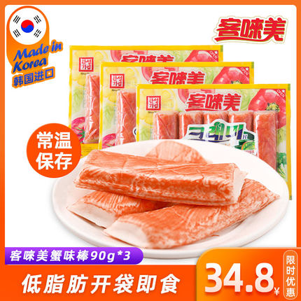 【韩国原装进口、0脂肪低卡路里:90gx3袋 客唻美 即食手撕仿蟹肉棒 券后29.8元包邮】