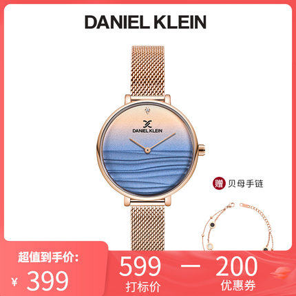 danielklein手表旗舰店599元,可领300元优惠券,实付299元到手。两色可选,并赠贝母手链,还有几天就七夕了,可以提前买了。欧美小众品牌,土耳其蓝表盘,戴你去浪漫的土耳其,3D海面设计,精钢米兰编织表链,4.9分好评。精致带点活泼,不会太浮夸,可温柔可率真,恰到好处。
