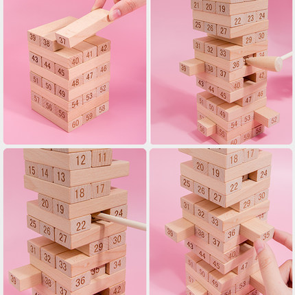叠叠高益智亲子玩具,甄选木材,耐摔耐磨,圆润边角,呵护稚嫩小手。30道文字互动游戏,通过推、敲、抽木条等精细动作,培养孩子观察动手能力,宝妈必备!【明星都在玩的积木】