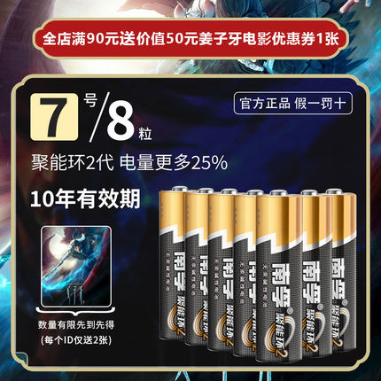 南孚麒剑专卖店18.9元,可领3元优惠券,实付15.9元到手,有5号8节、7号8节、5号4节+7号4节可选,线下小卖店是2.5/节,有效期10年。