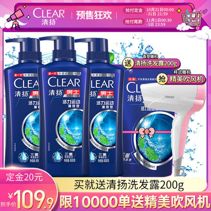 【清扬 男士活力薄荷运动洗发露 500ml*3瓶 94.9元21日0点抢 限前1w单送吹风机】
