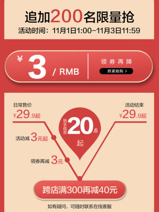 六只兔子旗舰店, 11月1-3日双11抢先购 ¥99.9元 抢先价, -20元优惠券, =79.9元 到手价,是正价209.9元的3.8折;