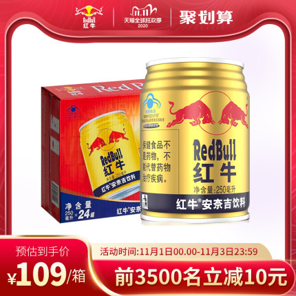 redbull红牛旗舰店, 11月1-3日双11抢先购 ¥119元 抢先价, -10元 下单立减, -10元优惠券, =99元 到手价, 规格250ml*24罐,线下便利店要6元,有需要的可以囤货一波。