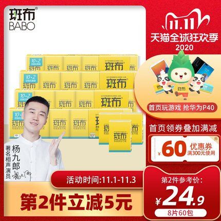 斑布BABO 随身装4层竹浆手帕纸巾 5条60包,原生竹浆本色纸选斑布!不漂白无荧光,食品级接触,抑菌更健康,母婴放心用!柔韧不掉屑,湿水不易破,小包纸出门携带超方便不占地儿~ 天猫有商家领券拍下26.9元包邮